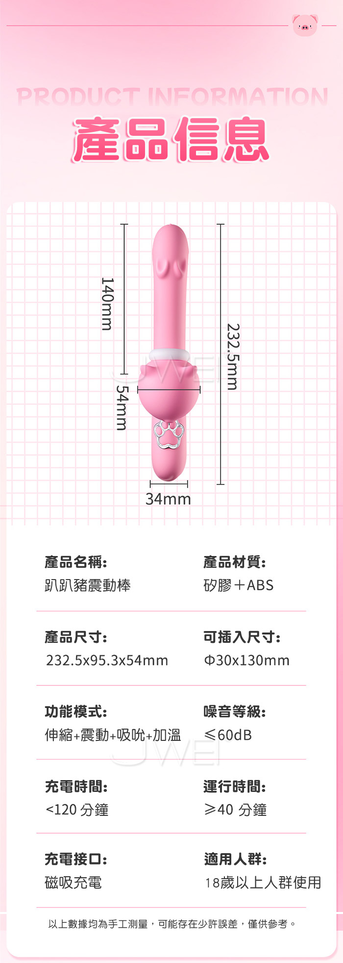 10頻強震大口吸力,深入探索極限快感,全方位穿透自動伸縮吸吮加溫 可旋式偏鳥吮吸嘴,支持360度自由調節無論側倚、蜷縮或半仰姿態皆能精准貼合肌廓 貓耳剮蹭,顛覆歡愉暢享絲滑入體高潮,黃金15度夾角,從猫耳到心間,感受剮蹭的每一刻溫柔 震感加倍,豬力全開爽玩還有,激發每一寸敏感的極致享受! 產品規格 ■材質: ABS+矽膠 ■規格: 詳如圖片標示 ■特色: 10頻震動、10頻伸縮、10頻吮吸、加溫