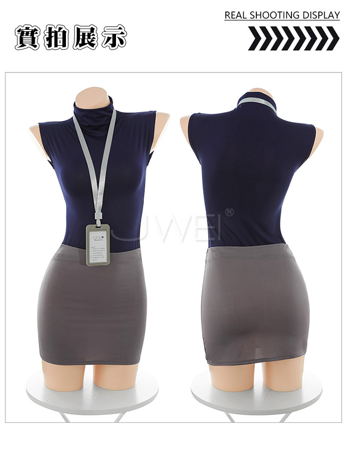情秘演繹.胸部可剪緊身包臀禁慾系OL秘書套裝-藍+灰【上衣+工牌+包臀裙+內褲】
