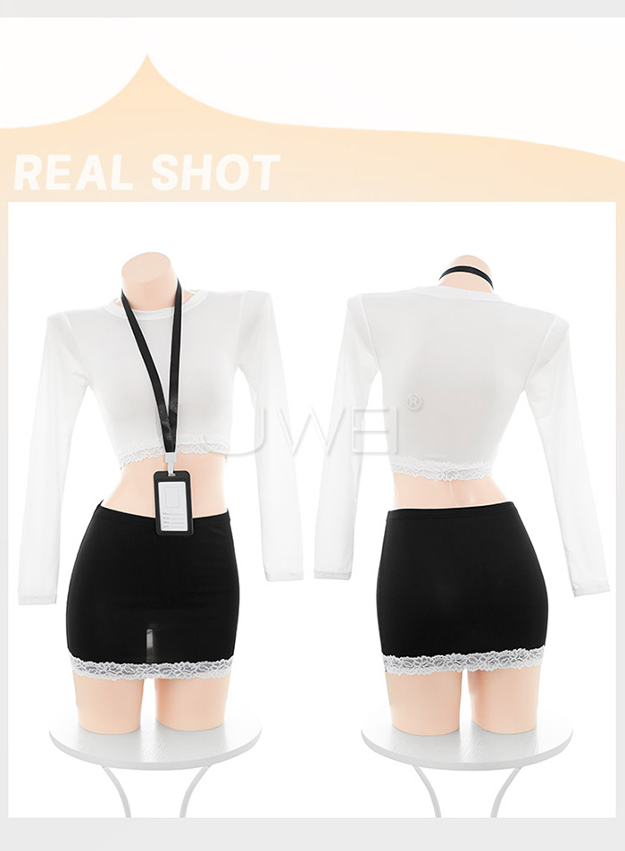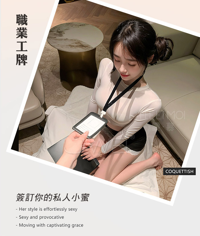 ►您現在的位置:首頁>職場佳麗.撩撥暗慾腰腹雙邊蕾絲秘書套裝【上衣+工牌+包臀裙】
