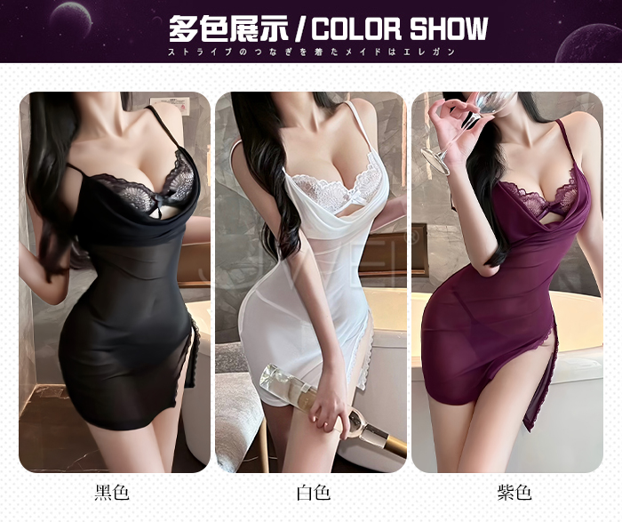 ►您現在的位置:首頁>月暮迷紗.性感裸紗蕩領透視側開衩細肩帶美背睡裙【睡裙+T褲-黑色】