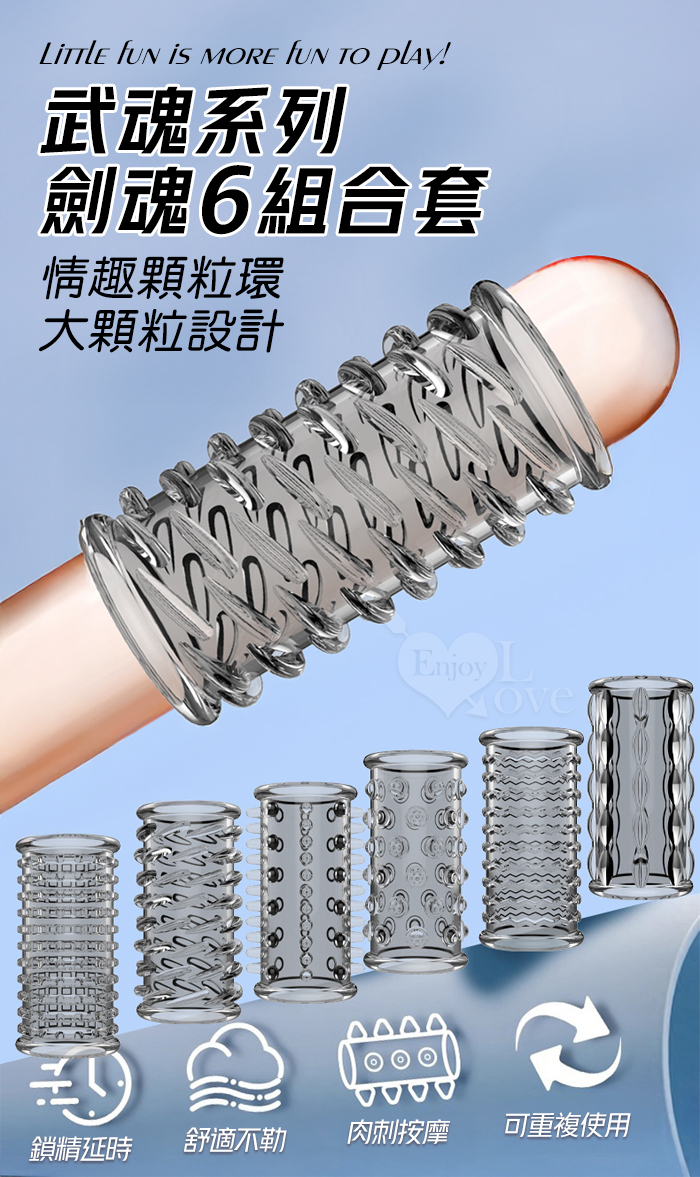 | 武魂系列.劍魂六組合套~顆粒入珠肉刺環繞鎖精延時陰莖加強環~成人性趣輔助用品-6款體驗裝﹝透明黑﹞