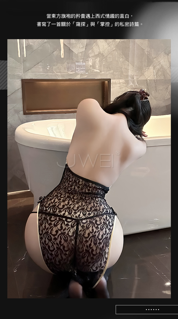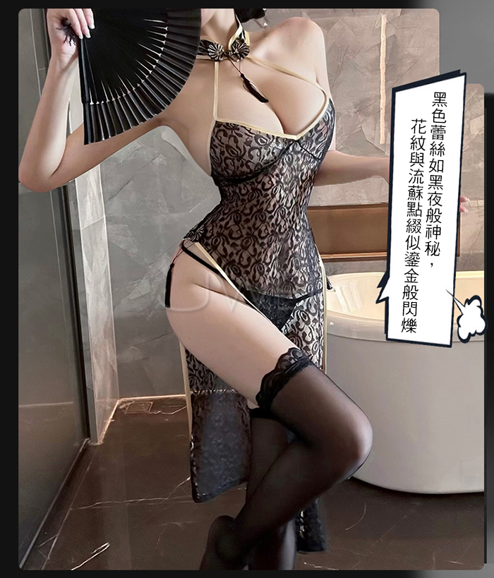 ►您現在的位置:首頁>墨染鎏金.性感純欲蕾絲花紋低胸開衩美背旗袍【旗袍+T褲】