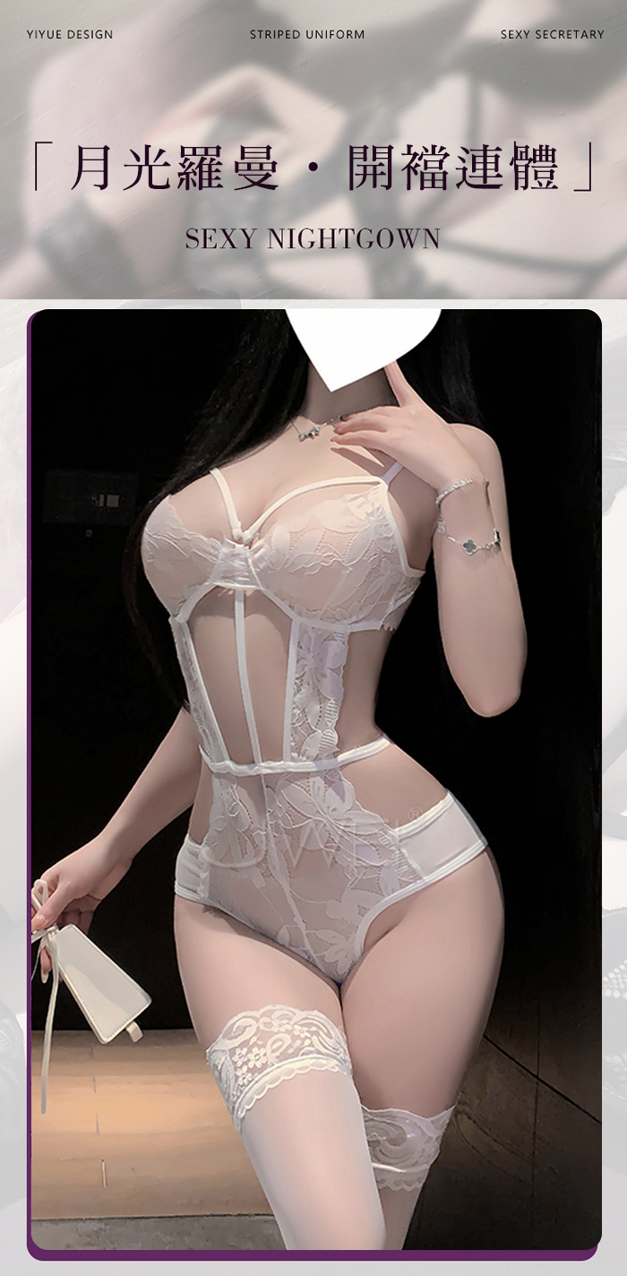 | 夜闌私語.深V露溝花蔓蕾絲修身暗釦開襠連體衣【白色】