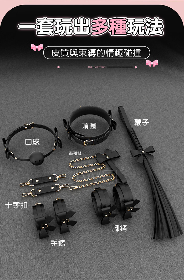 ►您現在的位置:首頁>SM束縛套裝. 黑色情趣 蝴蝶結皮革捆綁束縛7件組套裝