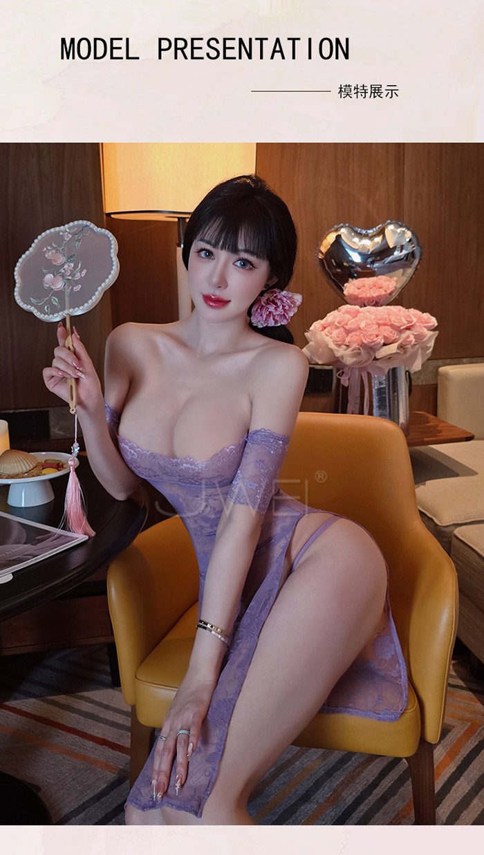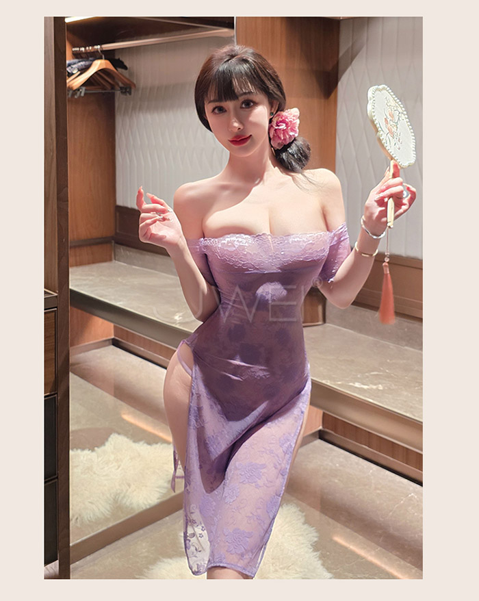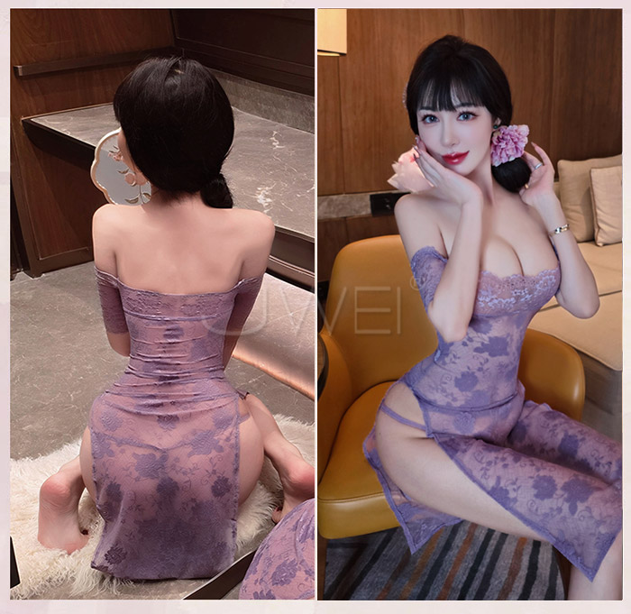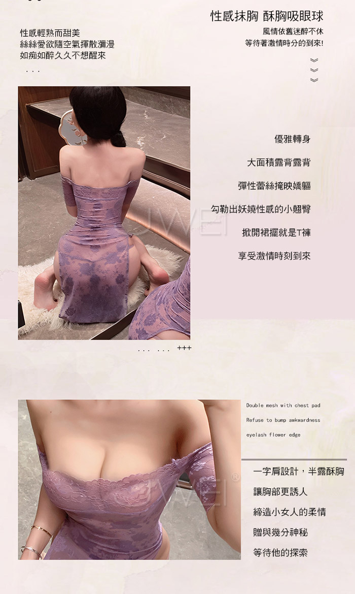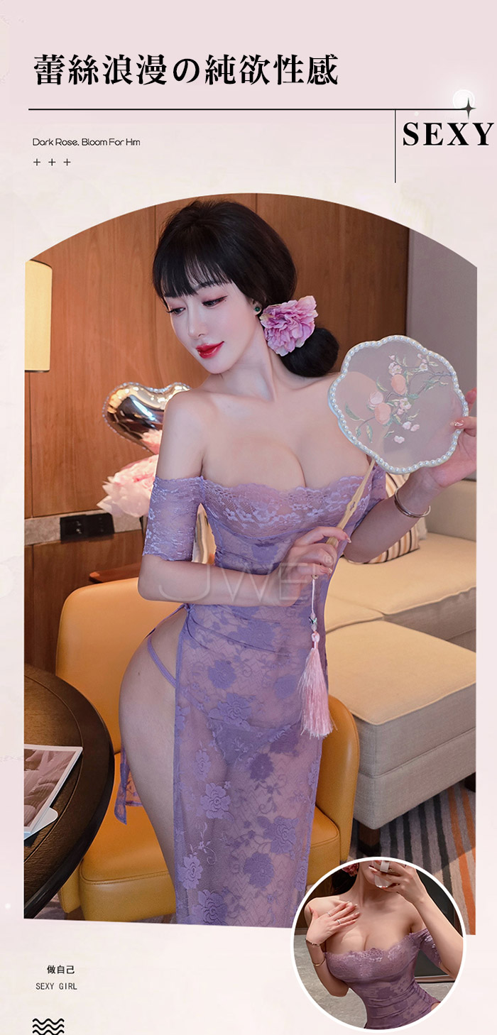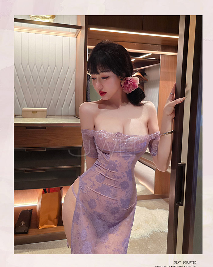 ►您現在的位置:首頁>漫野玫瑰.純欲一字肩蕾絲柔美鏤空開衩連身睡衣 【連衣裙+T褲】