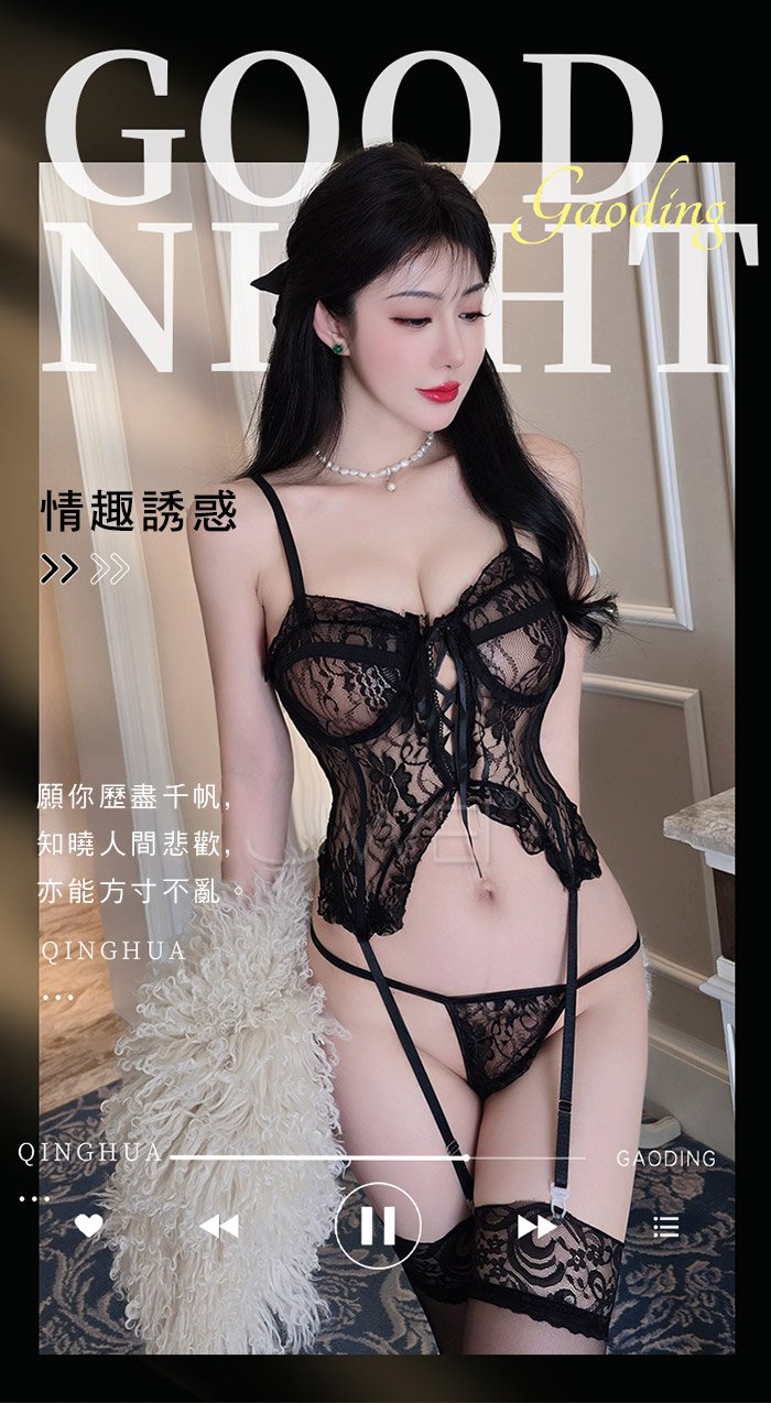 ►您現在的位置:首頁>輕紗綺夢.超A蕾絲吊帶半截裹胸性感吊襪帶馬甲-黑色【馬甲(含吊襪帶)+T褲+黑長筒絲襪】