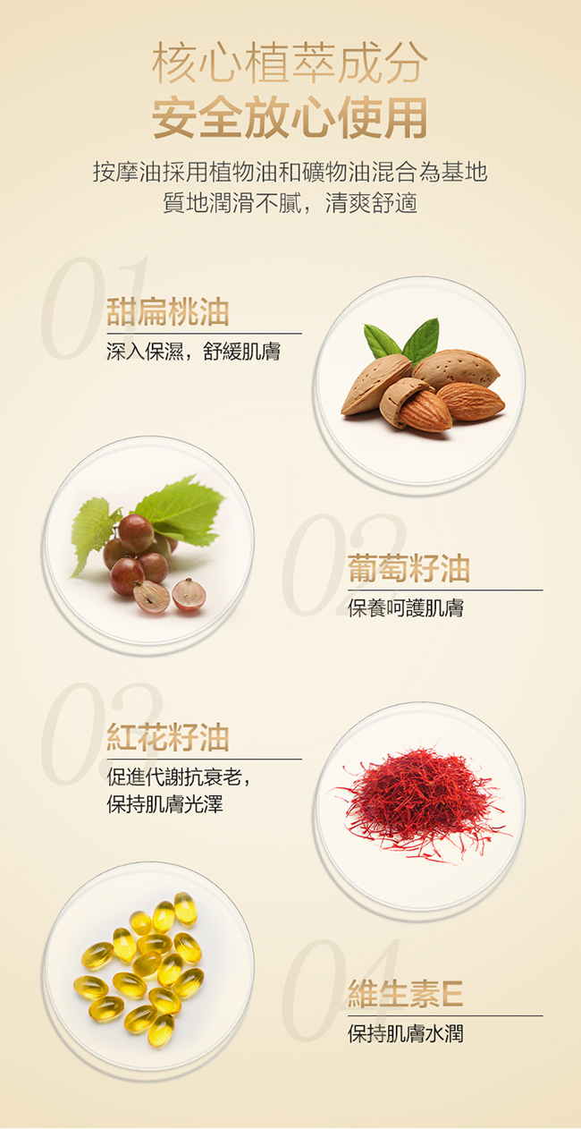 1.這款按摩油包含有很獨特的香氣,富含甜杏仁油,葡萄籽油等,長久保持皮膚滋潤和光澤,可以進行長時間的按摩。